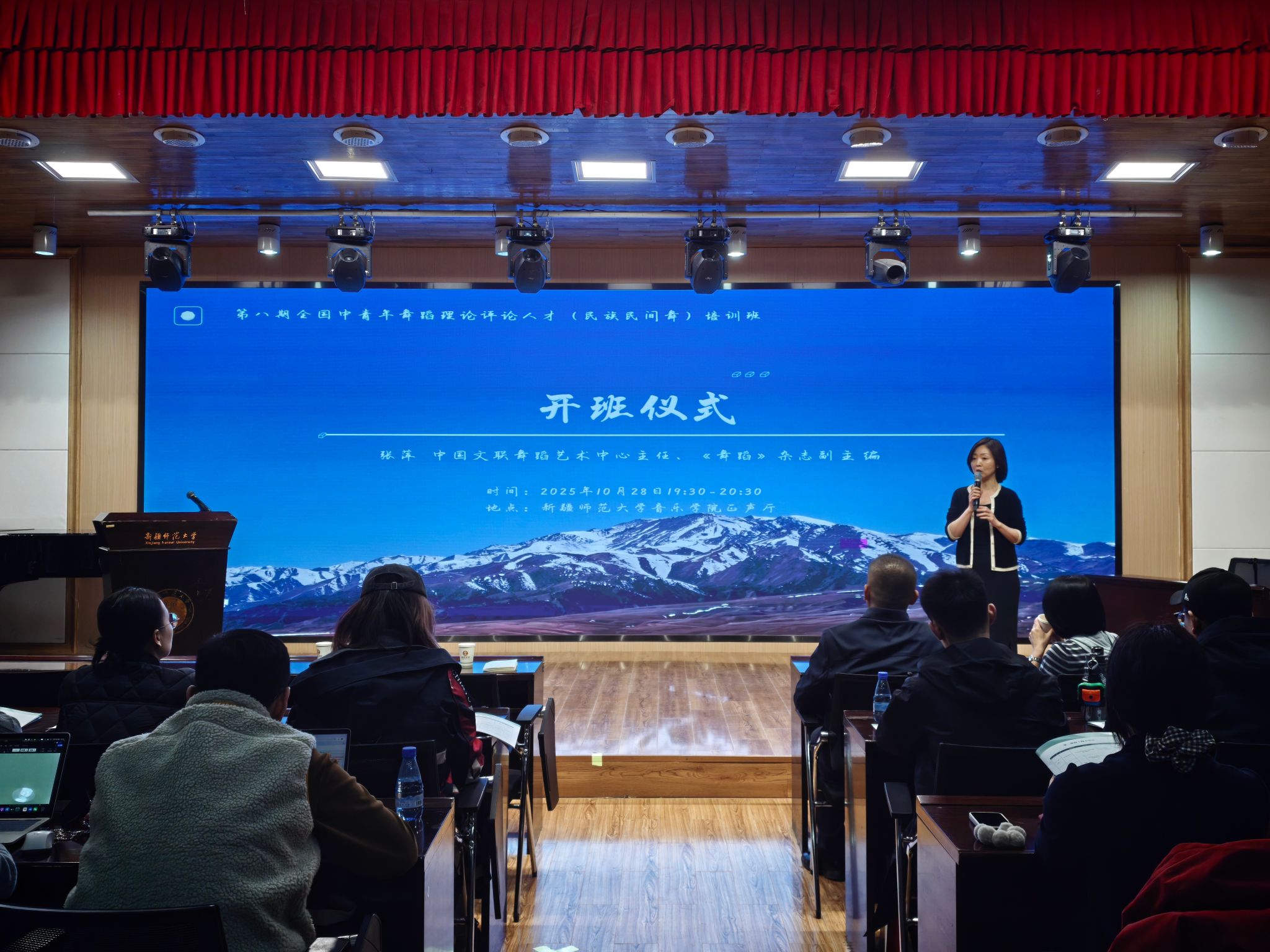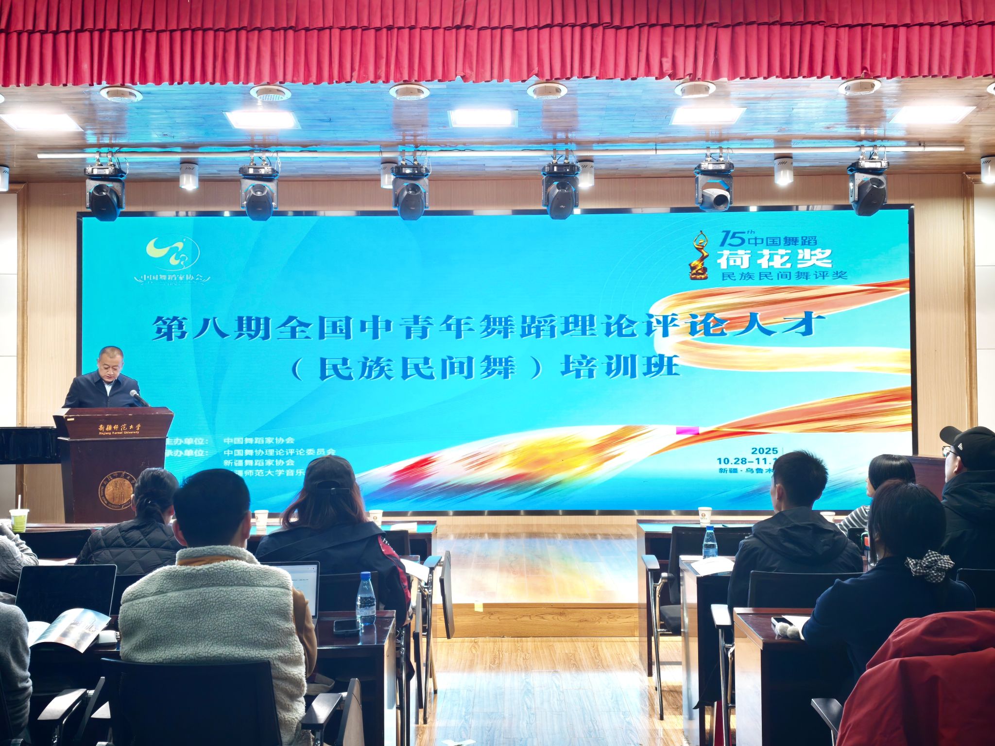 2025年10月28日晚,由中国舞蹈家协会主办,中国舞协理论评论委员会、新疆舞蹈家协会与我院联合承办的第八期全国中青年舞蹈理论评论人才(民族民间舞)培训班在我院正式开班。我院青年教师谢伊代·塔伊尔、张庭嘉及来自新西兰奥克兰大学、北京舞蹈学院、天津音乐学院、上海戏剧学院、中国艺术研究院、中央民族歌舞团等24所院团的30名学员参加开班仪式,仪式由中国舞协理论研究处处长唐坤主持,我院党委书记杨志刚出席仪式并致辞,中国文联舞蹈艺术中心主任、《舞蹈》杂志副主编张萍做专题讲授。
