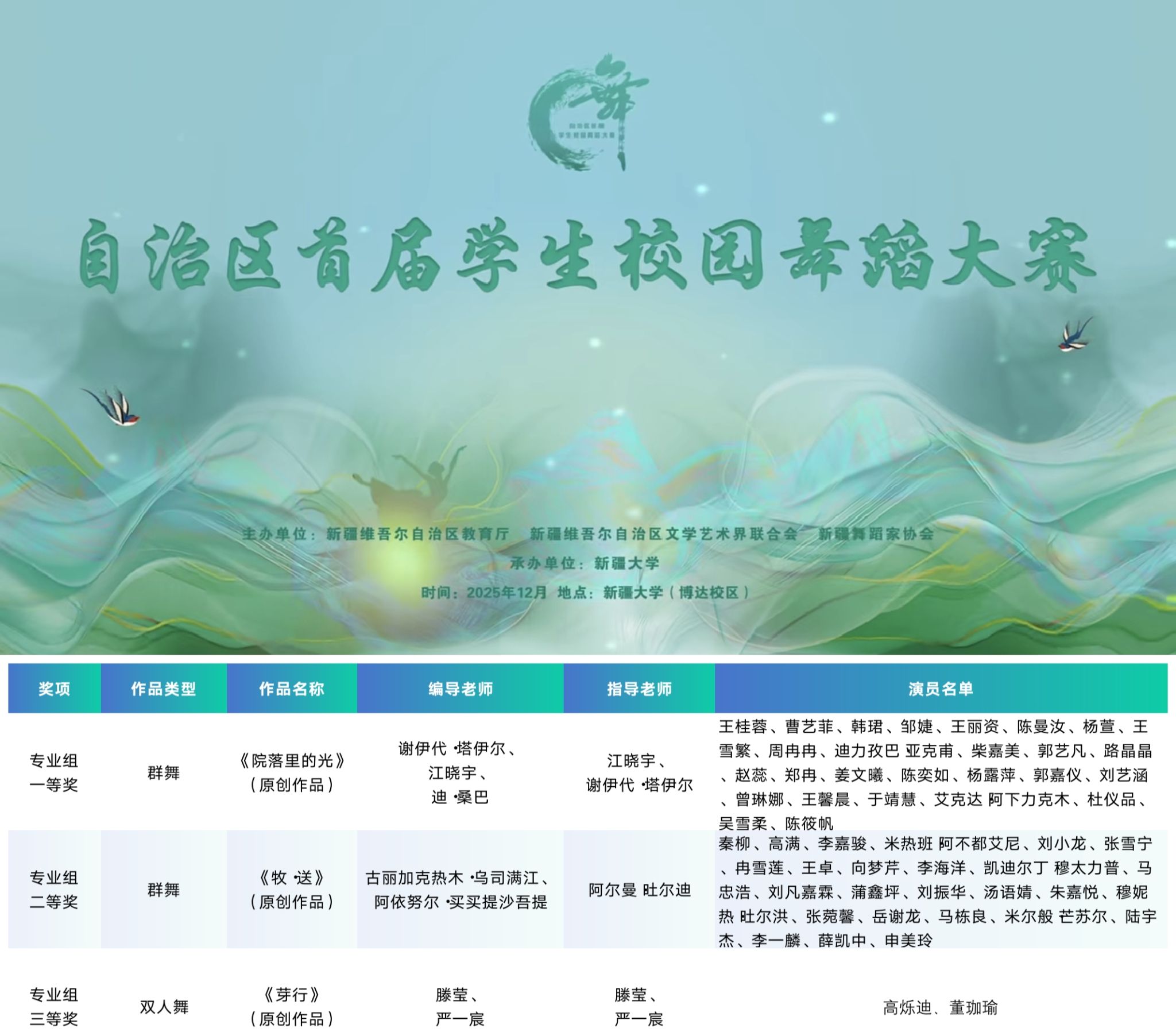 近期,在由自治区教育厅、自治区文联、新疆舞蹈家协会联合主办的自治区首届学生校园舞蹈大赛高校组决赛 中,经大赛初评、复评、决赛现场打分及公证处公证,我院舞蹈系师生分别斩获高校专业组一、二、三等奖。