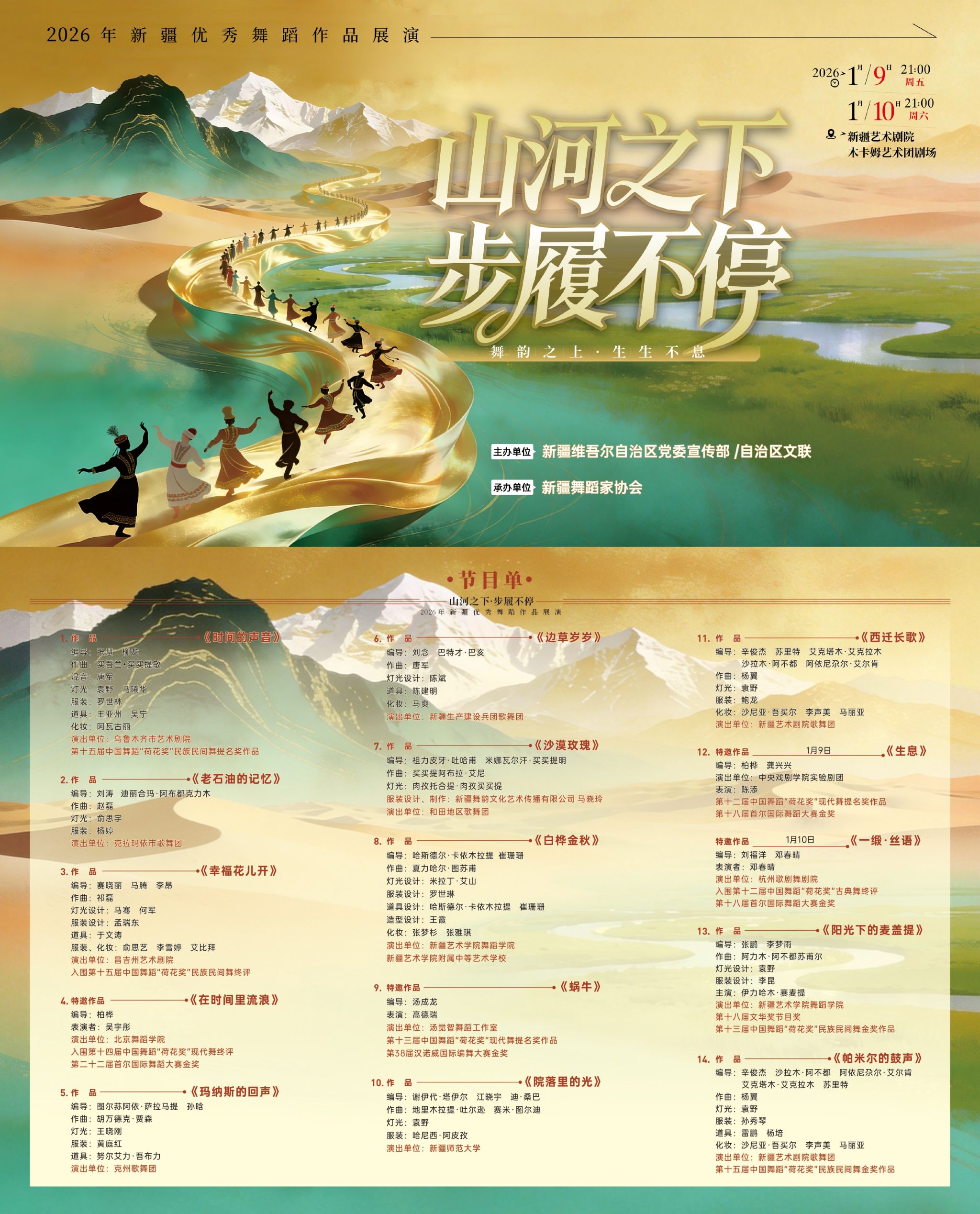 1月9日至10日,《山河之下,步履不停》2026年新疆优秀舞蹈作品展演在新疆艺术剧院木卡姆艺术团剧场圆满举行。我院舞蹈系师生排演的原创作品《院落里的光》在此次展演中绽放光彩。本次展演呈现了由自治区党委宣传部组织创作的一批优秀歌舞作品,汇聚全疆十余支优秀院团与院校的力量,涵盖维吾尔族、哈萨克族、蒙古族、塔吉克族、回族等多种民族舞蹈形式,以三大篇章、十四部佳作讲述这片土地上的坚守、生长与交融。